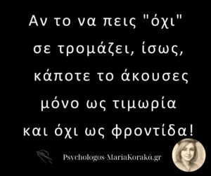 06 Απρ Αν το να πεις “όχι” σε τρομάζει … Posted at 10:06h in Τα Αποστάγματα μιας Ψυχοθεραπεύτριας 0 Comments 0 Likes Αν το να πεις “όχι” σε τρομάζει …