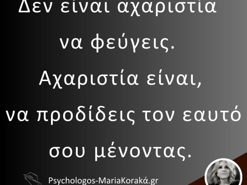 13 Σεπ Δεν είναι αχαριστία να φεύγεις. Αχαριστία είναι, να προδίδεις τον εαυτό σου μένοντας. Posted at 18:10h in Από μια γυναίκα που γύρισε πίσω στον εαυτό της, Εαυτός: Το πιο μακρύ ταξίδι με τον πιο σημαντικό προορισμό 0 Comments ΠΕΡΙΣΣΟΤΕΡΑ