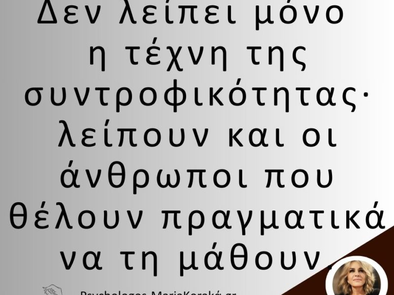 13 Σεπ Σήμερα δεν λείπει μόνο η τέχνη της συντροφικότητας∙ λείπουν και οι άνθρωποι που θέλουν πραγματικά να τη μάθουν. Posted at 18:13h in Εαυτός: Το πιο μακρύ ταξίδι με τον πιο σημαντικό προορισμό 0 Comments ΠΕΡΙΣΣΟΤΕΡΑ