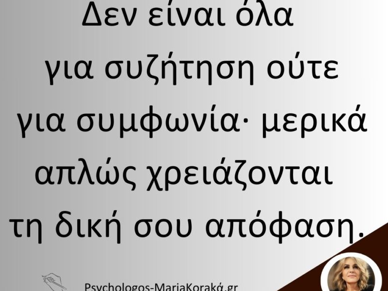 13 Σεπ Δεν είναι όλα για συζήτηση ούτε για συμφωνία∙ μερικά απλώς χρειάζονται τη δική σου απόφαση Posted at 18:20h in Εαυτός: Το πιο μακρύ ταξίδι με τον πιο σημαντικό προορισμό 0 Comments ΠΕΡΙΣΣΟΤΕΡΑ