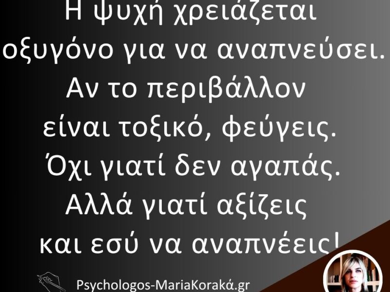 23 Ιούν Η ψυχή χρειάζεται οξυγόνο για να αναπνεύσει. Αν το περιβάλλον είναι τοξικό, φεύγεις. Όχι γιατί δεν αγαπάς. Αλλά γιατί αξίζεις και εσύ να αναπνέεις! Posted at 16:13h in Εαυτός: Το πιο μακρύ ταξίδι με τον πιο σημαντικό προορισμό 0 Comments ΠΕΡΙΣΣΟΤΕΡΑ