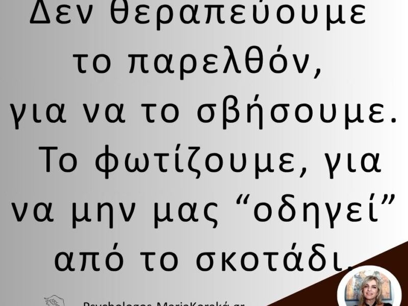 25 Ιούν Δεν θεραπεύουμε το παρελθόν, για να το σβήσουμε. Το φωτίζουμε, για να μην μας “οδηγεί” από το σκοτάδι. Posted at 09:14h in Εαυτός: Το πιο μακρύ ταξίδι με τον πιο σημαντικό προορισμό 0 Comments ΠΕΡΙΣΣΟΤΕΡΑ