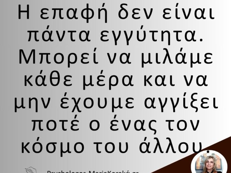 16 Ιούν Η επαφή δεν είναι πάντα εγγύτητα. Μπορεί να μιλάμε κάθε μέρα και να μην έχουμε αγγίξει ποτέ ο ένας τον κόσμο του άλλου. Posted at 23:13h in Ζευγάρι: Η τοξικότητα ντυμένη έρωτα 0 Comments ΠΕΡΙΣΣΟΤΕΡΑ