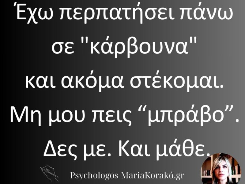 15 Απρ Έχω περπατήσει πάνω σε “κάρβουνα” και ακόμα στέκομαι. Μη μου πεις “μπράβο”. Δες με. Και μάθε. Posted at 15:41h in Εαυτός: Το πιο μακρύ ταξίδι με τον πιο σημαντικό προορισμό 0 Comments ΠΕΡΙΣΣΟΤΕΡΑ