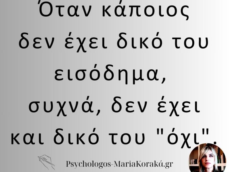 17 Απρ Όταν κάποιος δεν έχει δικό του εισόδημα, συχνά, δεν έχει και δικό του “όχι”. Posted at 10:00h in Ζευγάρι: Η τοξικότητα ντυμένη έρωτα 0 Comments ΠΕΡΙΣΣΟΤΕΡΑ