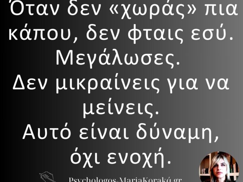 23 Απρ Όταν δεν «χωράς» πια κάπου, δεν φταις εσύ. Μεγάλωσες. Δεν μικραίνεις για να μείνεις. Αυτό είναι δύναμη, όχι ενοχή. Posted at 15:50h in Εαυτός: Το πιο μακρύ ταξίδι με τον πιο σημαντικό προορισμό 0 Comments ΠΕΡΙΣΣΟΤΕΡΑ