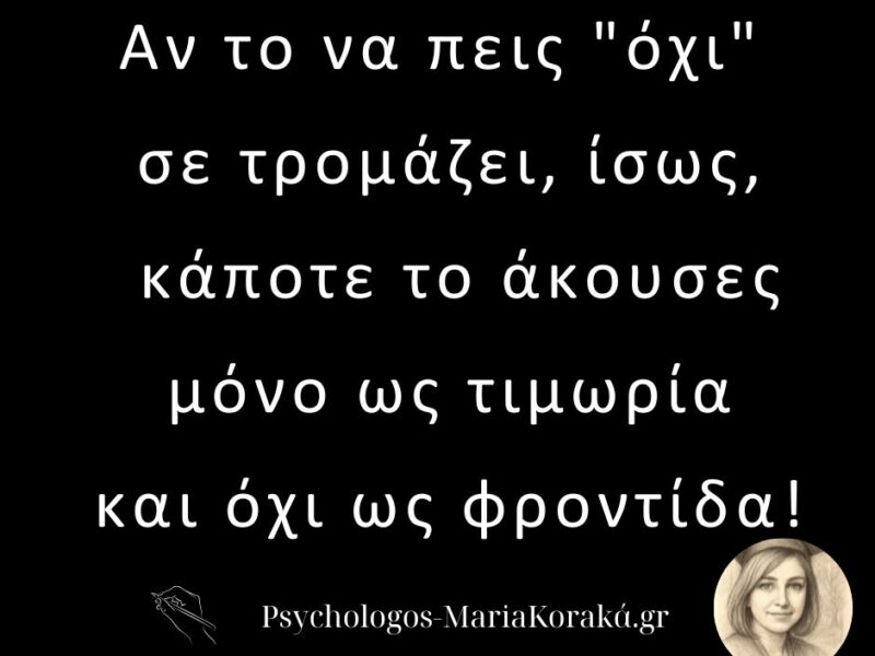 06 Απρ Αν το να πεις “όχι” σε τρομάζει … Posted at 10:06h in Τα Αποστάγματα μιας Ψυχοθεραπεύτριας 0 Comments ΠΕΡΙΣΣΟΤΕΡΑ