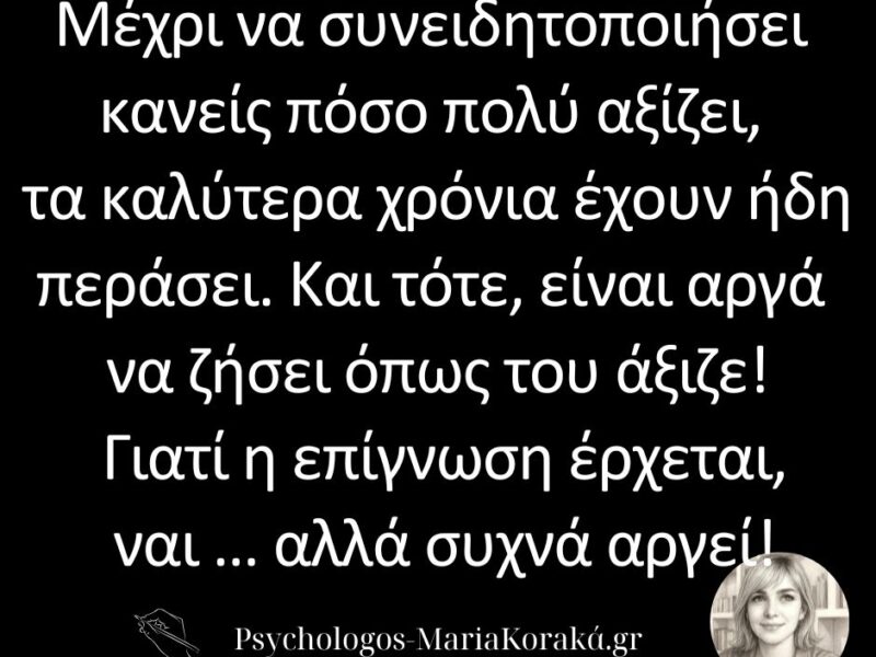 07 Απρ Μέχρι να συνειδητοποιήσει κανείς πόσο πολύ αξίζει, τα καλύτερα χρόνια έχουν ήδη περάσει. Posted at 17:26h in Τα Αποστάγματα μιας Ψυχοθεραπεύτριας 0 Comments ΠΕΡΙΣΣΟΤΕΡΑ