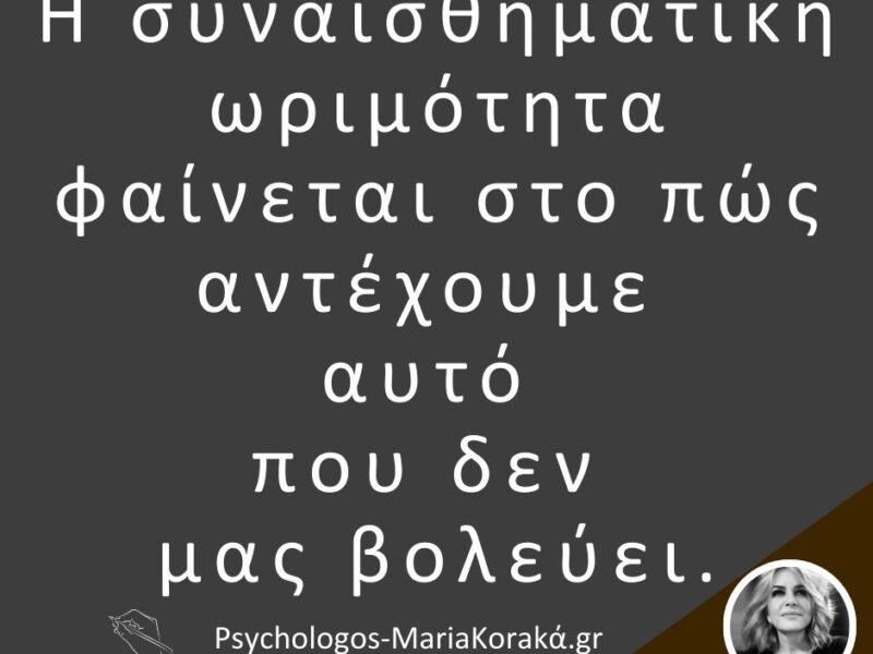 17 Φεβ Η συναισθηματική ωριμότητα φαίνεται στο πώς αντέχουμε αυτό που δεν μας βολεύει. Posted at 21:37h in Εαυτός: Το πιο μακρύ ταξίδι με τον πιο σημαντικό προορισμό 0 Comments ΠΕΡΙΣΣΟΤΕΡΑ