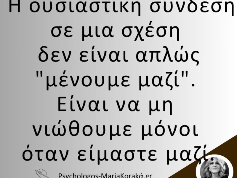 26 Φεβ Η ουσιαστική σύνδεση σε μια σχέση δεν είναι να “μένουμε μαζί”. Είναι να μη “νιώθουμε μόνοι όταν είμαστε μαζί”. Posted at 12:48h in Ζευγάρι: Το δικό μας “μαζί” 0 Comments ΠΕΡΙΣΣΟΤΕΡΑ
