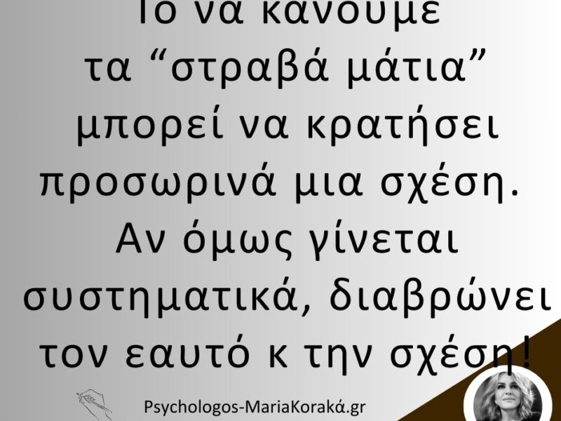 16 Φεβ Το να κάνουμε τα “στραβά μάτια” μπορεί να κρατήσει προσωρινά μια σχέση. Αν όμως γίνεται συστηματικά, διαβρώνει τον εαυτό κ την σχέση! Posted at 11:26h in Ζευγάρι: Το δικό μας “μαζί” 0 Comments ΠΕΡΙΣΣΟΤΕΡΑ