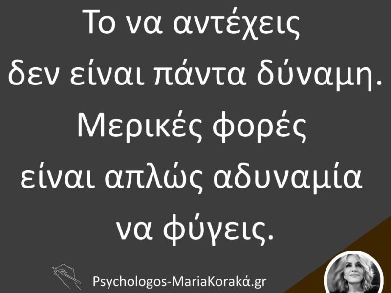 18 Ιαν Το να αντέχεις δεν είναι πάντα δύναμη. Μερικές φορές είναι απλώς αδυναμία να φύγεις. Posted at 19:43h in Εαυτός: Το πιο μακρύ ταξίδι με τον πιο σημαντικό προορισμό 0 Comments ΠΕΡΙΣΣΟΤΕΡΑ