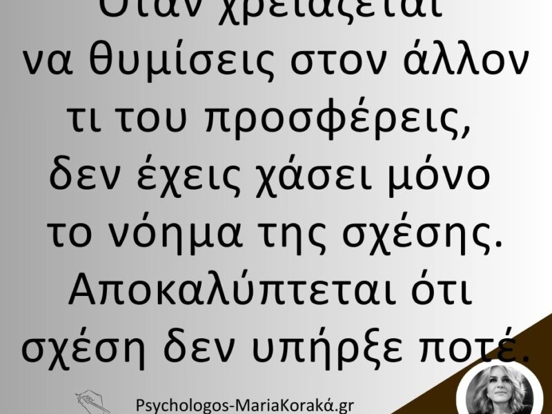 18 Ιαν Όταν χρειάζεται να θυμίσεις στον άλλον τι του προσφέρεις, δεν έχεις χάσει μόνο το νόημα της σχέσης. Αποκαλύπτεται ότι σχέση δεν υπήρξε ποτέ. Posted at 19:40h in Εαυτός: Το πιο μακρύ ταξίδι με τον πιο σημαντικό προορισμό 0 Comments ΠΕΡΙΣΣΟΤΕΡΑ