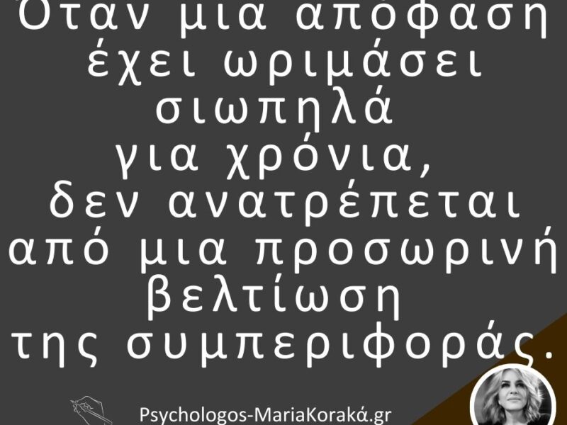 16 Φεβ Όταν μια απόφαση έχει ωριμάσει σιωπηλά για χρόνια, δεν ανατρέπεται από μια προσωρινή βελτίωση της συμπεριφοράς. Posted at 11:24h in Εαυτός: Το πιο μακρύ ταξίδι με τον πιο σημαντικό προορισμό 0 Comments ΠΕΡΙΣΣΟΤΕΡΑ