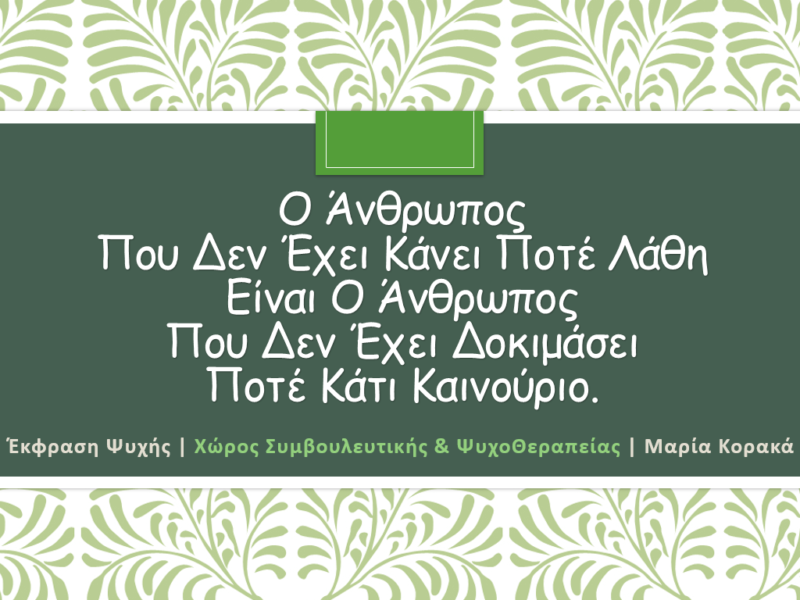 13 Οκτ Έκφραση Ψυχής | Χώρος Συμβουλευτικής & ΨυχοΘεραπείας Posted at 08:28h in ΜΑΡΙΑ Κ 0 Comments ΠΕΡΙΣΣΟΤΕΡΑ