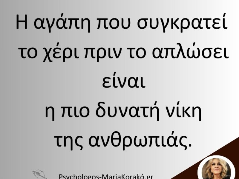 07 Νοέ Η αγάπη που συγκρατεί το χέρι πριν το απλώσει είναι η πιο δυνατή νίκη της ανθρωπιάς. Posted at 00:25h in Η καθημερινότητα ως τραύμα – Μια ψυχολογική ανάγνωση της εποχής μας 0 Comments ΠΕΡΙΣΣΟΤΕΡΑ