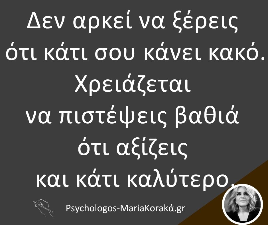 22 Μαρ Δεν αρκεί να ξέρεις ότι κάτι σου κάνει κακό. Χρειάζεται να πιστέψεις βαθιά ότι αξίζεις και κάτι καλύτερο.