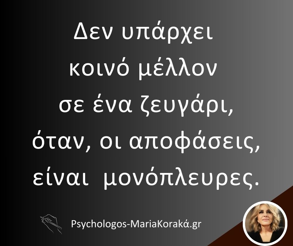 13 Σεπ Δεν υπάρχει κοινό μέλλον σε ένα ζευγάρι, όταν οι αποφάσεις είναι μονόπλευρες.