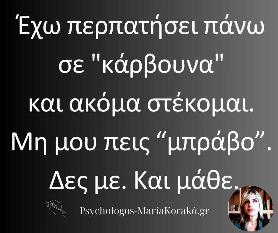 Έχω περπατήσει πάνω σε “κάρβουνα” και ακόμα στέκομαι. Μη μου πεις “μπράβο”. Δες με. Και μάθε.