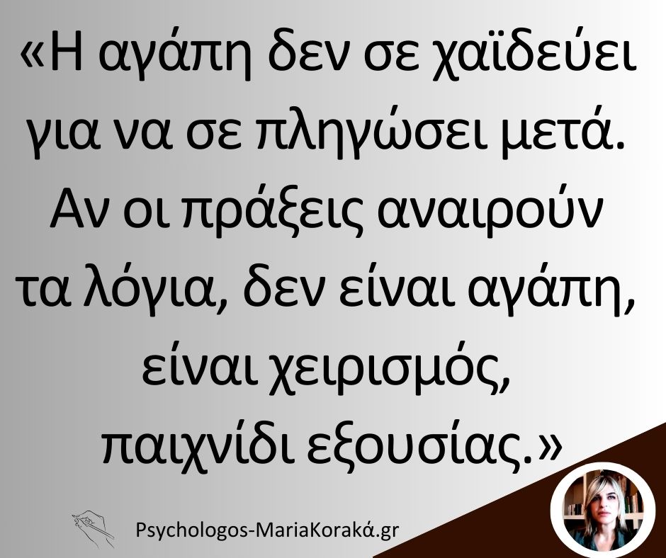 21 Αυγ Η αγάπη δεν σε χαϊδεύει για να σε πληγώσει μετά. Αν οι πράξεις αναιρούν τα λόγια, δεν είναι αγάπη, είναι χειρισμός, παιχνίδι εξουσίας.