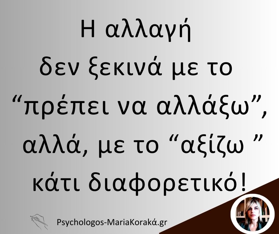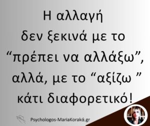 24 Μάι Η αλλαγή δεν ξεκινά με το “πρέπει να αλλάξω”, αλλά, με το “αξίζω ” κάτι διαφορετικό! Posted at 12:37h in Εαυτός: Το πιο μακρύ ταξίδι με τον πιο σημαντικό προορισμό 0 Comments 0 Likes