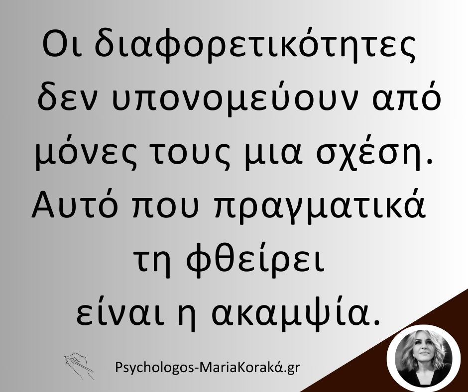 Οι διαφορετικότητες δεν υπονομεύουν από μόνες τους μια σχέση. Αν συνέβαινε αυτό, καμία ανθρώπινη σύνδεση δεν θα άντεχε περισσότερο από έναν μήνα. Αυτό που πραγματικά τη φθείρει είναι η ακαμψία. Η εμμονή του καθενός να παραμένει περιορισμένος στις δικές του συνήθειες και βεβαιότητες, χωρίς διάθεση να μετακινηθεί έστω και ελάχιστα. Η σχέση δεν απαιτεί ομοιομορφία. Απαιτεί ευελιξία. Χρειάζεται μια στοιχειώδης μετάβαση από το «λειτουργώ μόνο όπως έχω μάθει» στο «λαμβάνω υπόψη μου και τον άλλον».
