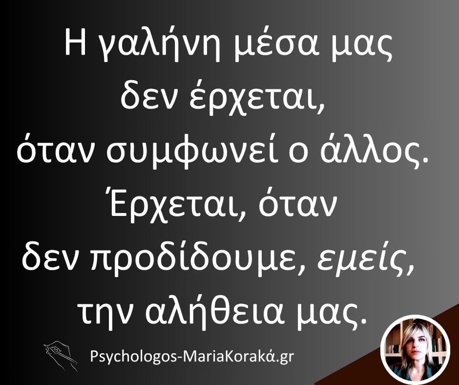 04 Αυγ Η γαλήνη μέσα μας, δεν έρχεται όταν συμφωνεί ο άλλος. Έρχεται, όταν δεν προδίδουμε, εμείς, την αλήθεια μας.