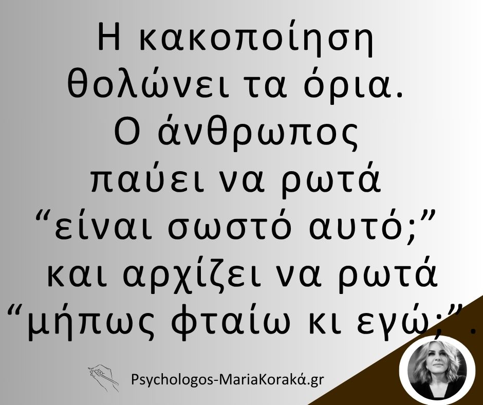 22 Μαρ Η κακοποίηση θολώνει τα όρια. Ο άνθρωπος παύει να ρωτά “είναι σωστό αυτό;” και αρχίζει να ρωτά “μήπως φταίω κι εγώ;”