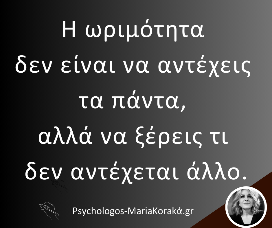 Η ωριμότητα έρχεται όταν ο άνθρωπος μπορεί να διακρίνει τι τον μεγαλώνει και τι τον μικραίνει. Όταν σταματά να αποδεικνύει ότι αντέχει και αρχίζει να αναγνωρίζει τι του κοστίζει. Δεν είναι φυγή ούτε παραίτηση. Είναι επίγνωση. Είναι η στιγμή που ο σεβασμός προς τον εαυτό προηγείται της ανάγκης να κρατηθούν ισορροπίες με κάθε τίμημα. Και τότε οι επιλογές γίνονται λιγότερο φοβισμένες και περισσότερο αληθινές.