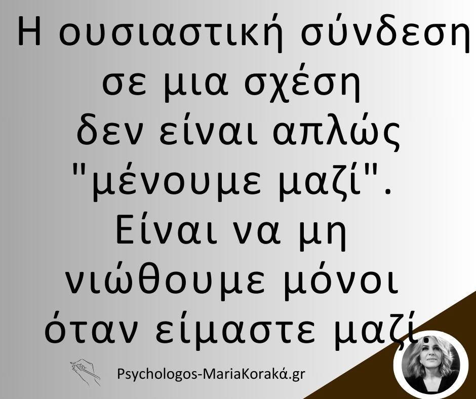 26 Φεβ Η ουσιαστική σύνδεση σε μια σχέση δεν είναι να “μένουμε μαζί”. Είναι να μη “νιώθουμε μόνοι όταν είμαστε μαζί”.