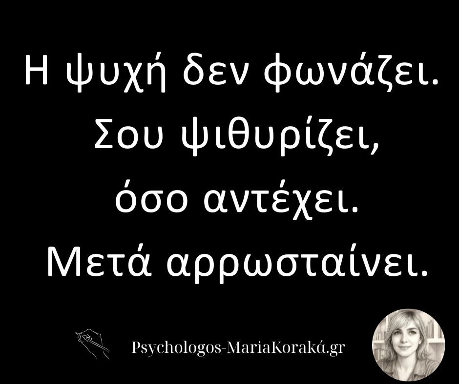 11 Απρ Η ψυχή δεν φωνάζει. Σου ψιθυρίζει, όσο αντέχει. Μετά αρρωσταίνει. Posted at 10:53h in Εαυτός: Το πιο μακρύ ταξίδι με τον πιο σημαντικό προορισμό 0 Comments 0 Likes Η ψυχή δεν φωνάζει. Σου ψιθυρίζει, όσο αντέχει. Μετά αρρωσταίνει.