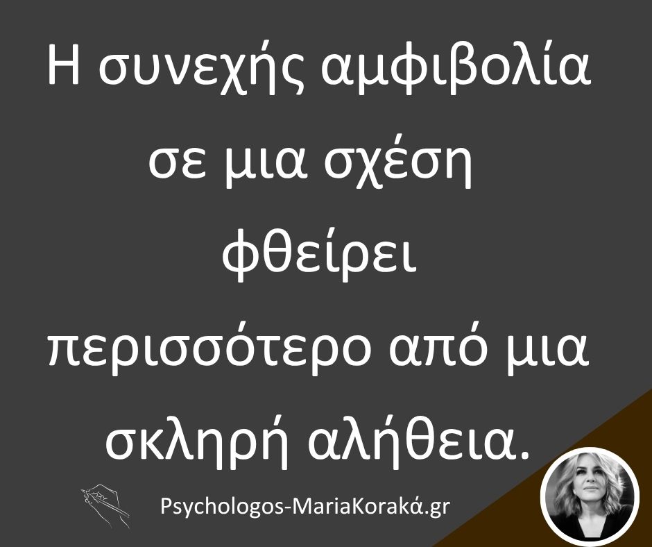 29 Μαρ Η συνεχής αμφιβολία σε μια σχέση φθείρει περισσότερο από μια σκληρή αλήθεια. Posted at 13:50h in Ζευγάρι: Η τοξικότητα ντυμένη έρωτα 0 Comments 0 Likes Η συνεχής αμφιβολία σε μια σχέση φθείρει περισσότερο από μια σκληρή αλήθεια.