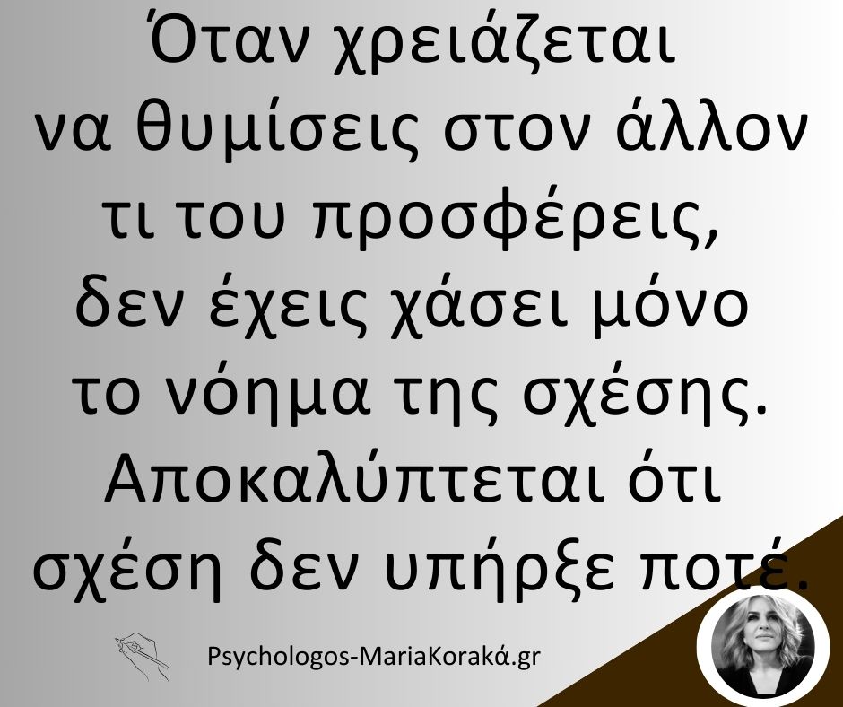 18 Ιαν Όταν χρειάζεται να θυμίσεις στον άλλον τι του προσφέρεις, δεν έχεις χάσει μόνο το νόημα της σχέσης. Αποκαλύπτεται ότι σχέση δεν υπήρξε ποτέ.