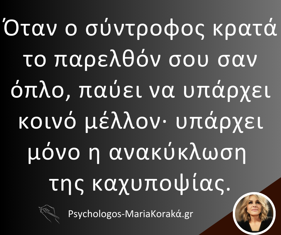 Όταν, αντί για αυτά, ανασύρεται διαρκώς το παρελθόν και χρησιμοποιείται σαν κατηγορία ή σαν όπλο, η σχέση παγιδεύεται σε έναν κύκλο φθοράς.