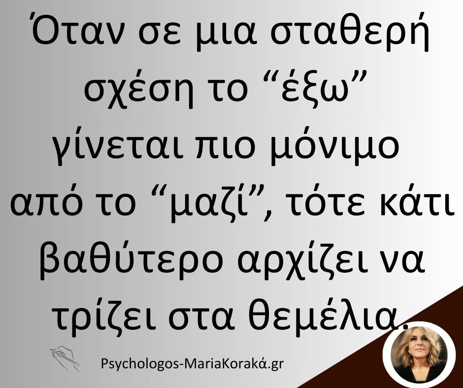 13 Σεπ Όταν σε μια σταθερή σχέση το “έξω” γίνεται πιο μόνιμο από το “μαζί”, τότε κάτι βαθύτερο αρχίζει να τρίζει στα θεμέλια.