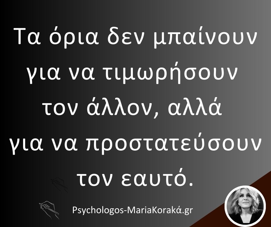 Τα όρια δεν μπαίνουν για να τιμωρήσουν τον άλλον, αλλά για να προστατεύσουν τον εαυτό. Όταν τα όρια παρεξηγούνται ως επίθεση, συνήθως κουβαλούν μέσα τους παλιά βιώματα εγκατάλειψης ή ελέγχου. Στην πραγματικότητα, το όριο είναι μια πράξη ευθύνης και όχι απόρριψης. Είναι η στιγμή που ο άνθρωπος αναγνωρίζει μέχρι πού μπορεί να δώσει χωρίς να χάνει τον εαυτό του. Εκεί όπου δεν υπάρχουν όρια, η σχέση γεμίζει θυμό, σιωπή και παθητική επιθετικότητα. Όχι επειδή δεν υπάρχει αγάπη, αλλά επειδή δεν υπάρχει χώρος.