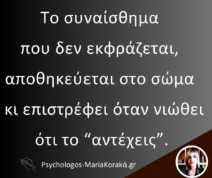 24 Μάι Το συναίσθημα που δεν εκφράζεται, αποθηκεύεται στο σώμα κι επιστρέφει όταν νιώθει ότι το “αντέχεις”. Posted at 13:26h in Εαυτός: Το πιο μακρύ ταξίδι με τον πιο σημαντικό προορισμό 0 Comments 0 Likes